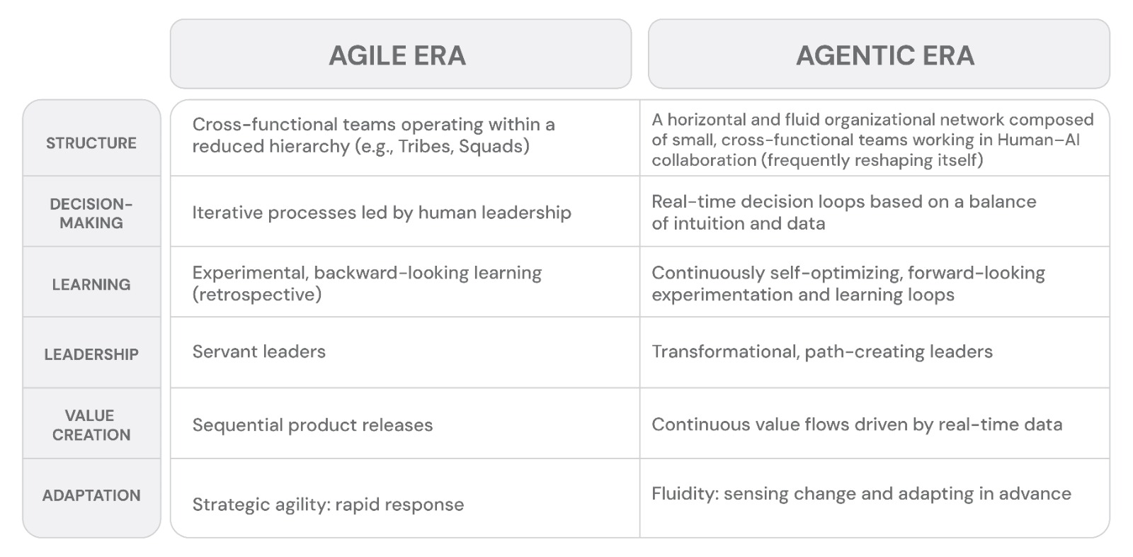 The second important step in agentic transformation is moving away from a project-based delivery approach to continuously learning, results-oriented agentic product teams. This new structure is actually similar to the product/service-oriented team network structure we are familiar with from Agile organizations, perhaps only changing shape more frequently. I'm talking about an organism organization that behaves like a living neural network, shaped around the product/context and value creation. A structure that changes shape based on insights from artificial intelligence and automatic learning cycles. Teams come together, disperse, and reform as needed—each time adapting to a new opportunity, problem, or priority. As I said, we are actually familiar with organizations changing shape in the previous digital agile world, albeit at a somewhat slower pace. In the fast-changing Agile digital structure, we can say that the lifespan of a team or team structure is a few years, and that structural changes are almost always necessary within a few years. Now, in much faster changing conditions, we have new tools such as AI-powered team and network analysis tools that can enable the organization to change shape much more quickly, examining where the organization is slowing down and getting stuck. With these tools, it is possible to enable the organization to proactively reshape itself in an insightful and intuitive way.